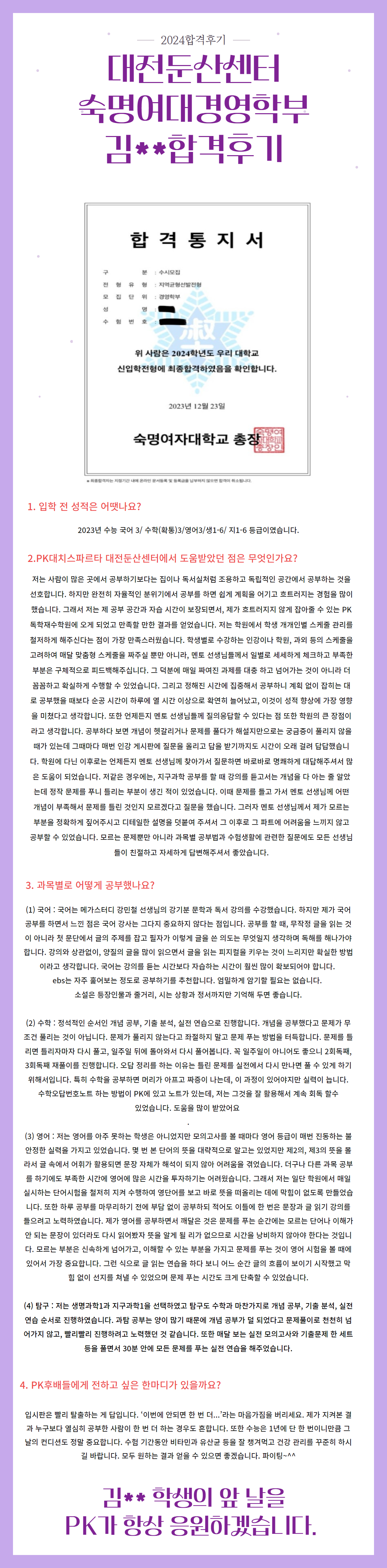 2024-대전둔산센터 숙명여대 합격후기